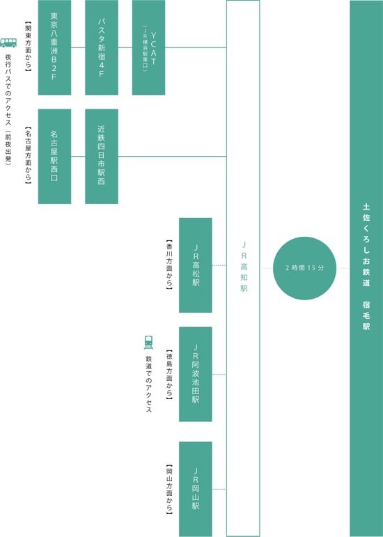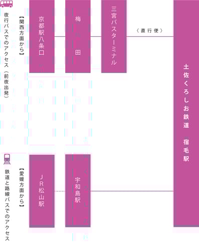 - 関西方面からの直通夜行バスは AM7:40、それ以外は PM12:06に宿毛駅集合となります。遅れる場合はご連絡ください。